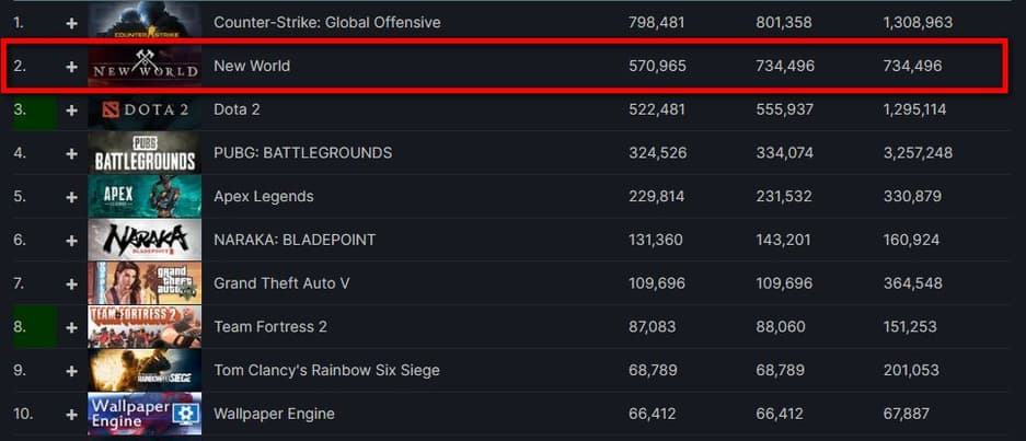 Буквально ворвавшаяся в топы Steam, положив при этом свои собственные сервера, New World уверенно удерживает вторую позицию по числу активных игроков, оставив далеко позади другой хит этого года Valheim и толпясь в компании Dota 2, Apex Legends, PUBG и CS: GO.