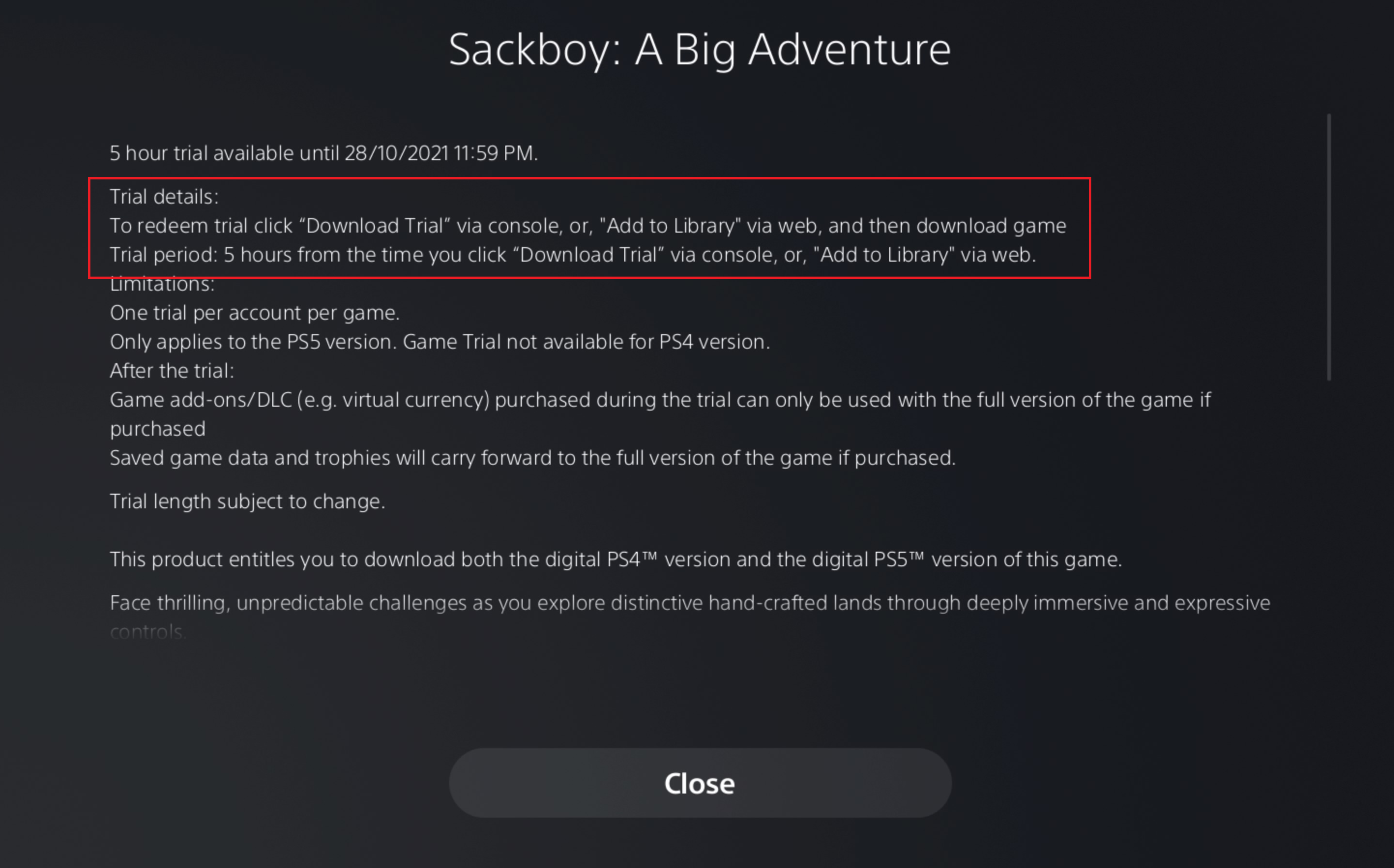 Также упоминается о том, что «одна пробная версия для каждой учетной записи на игру» и «Game Trial» распространяется лишь на PS5-версии. Также пишут, что пробные версии доступны до 28 октября.