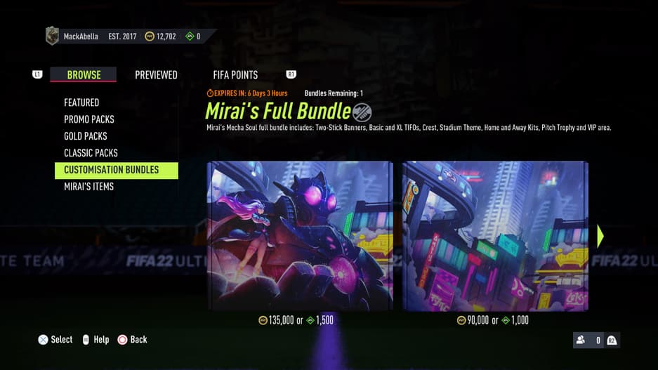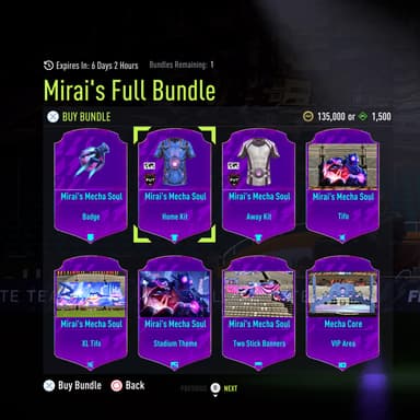 В набор «Мирай» входят разные косметические вещи, такие как декоративные элементы для стадиона, форма, специальный значок, знамя и многое другое. Полный комплект, который будет доступен примерно в течение недели, предлагается за скромную сумму в 135 000 монет FUT, что эквивалентно 1500 FIFA Points (чуть меньше 15 евро).