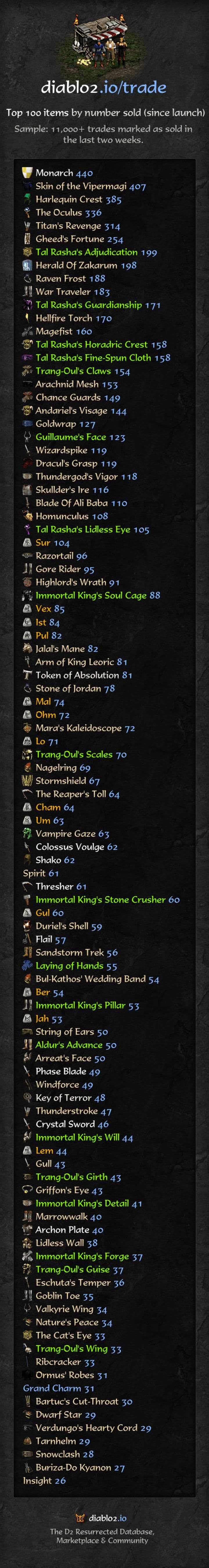 По словам администратора, за указанный период через diablo2.io совершено более 11 000 сделок с внутриигровыми предметами. Как видно из приведенной выше инфографики, на вершине списка оказались щиты типа «Монарх». Это элитные версии треугольных щитов, обеспечивающие высокую защиту от урона и шанс блокирования. Они были приобретены через diablo2.io 440 раз. На втором месте Skin of Vipermagi, уникальная броня, дающая +1 ко всем навыкам и +30% к скорости произнесения заклинаний, а на третьем – Harlequin Crest, элитный шлем, дающий бонусы к способностям и характеристикам.