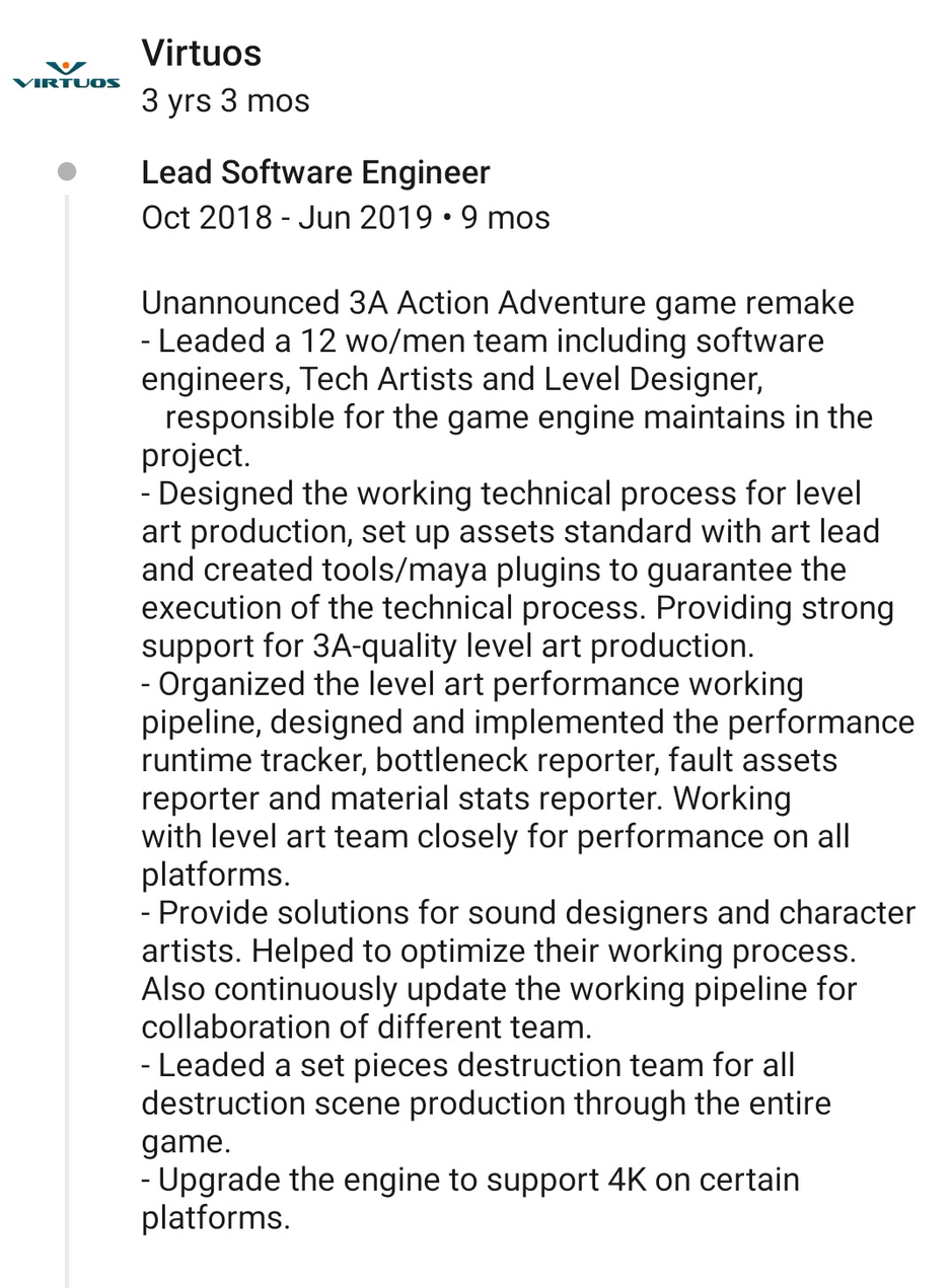 Похоже, что разработку косвенно удалось подтвердить. В LinkedIn-профиле ведущего программиста Virtuous обнаружили упоминание ремейка неназванного приключенческого боевика.