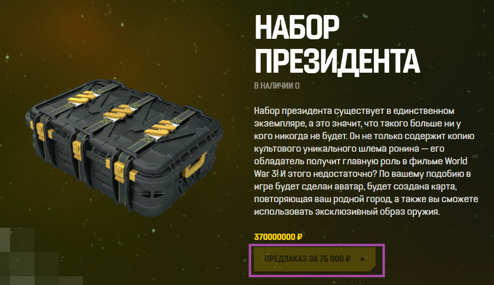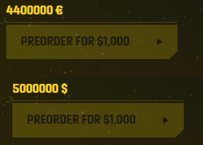 Разработчики представили несколько наборов, в том числе «president pack», за который попросили 5 миллионов долларов (или 370 миллионов рублей на русскоязычной версии сайта). Стоит отметить, что по какой-то причине на всё той же странице с набором кнопка «Предзаказ» показывает чуть более скромную стоимость: 1000 долларов или 75 тысяч рублей.