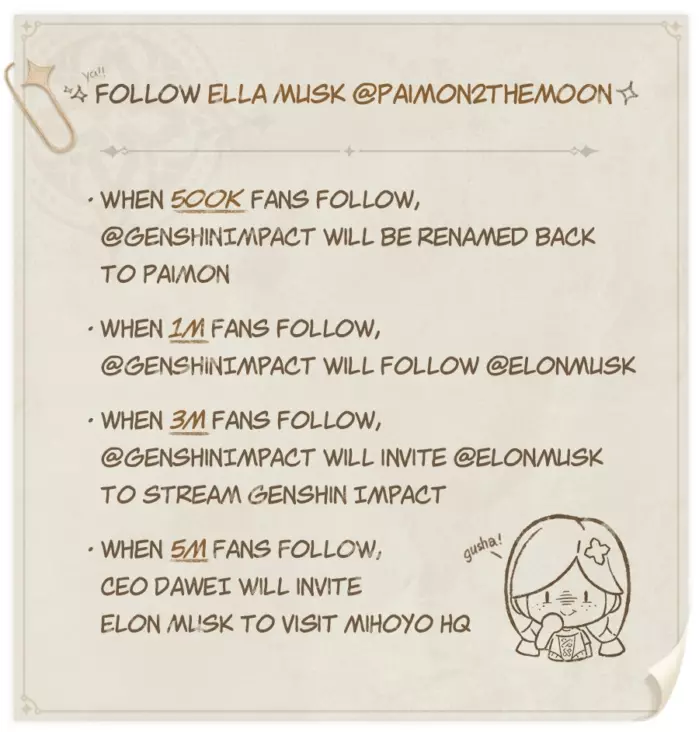 Разработчики условно-бесплатной боевой ролевой игры Genshin Impact опять отличились и взбесили фанатов. На это раз miHoYo предложила подписываться на Twitter-аккаунт Ella Musk.