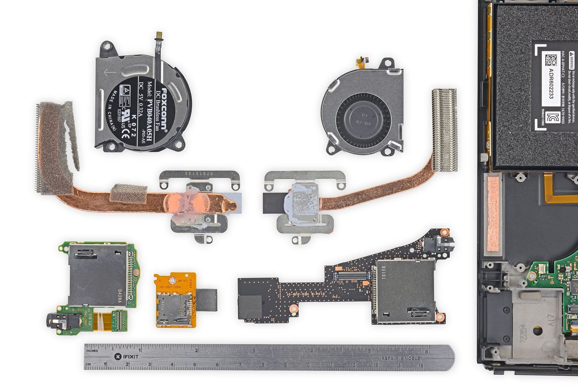 На изображении виден радиатор и вентилятор оригинального Switch слева, а новые, более компактные версии — справа. Система охлаждения уменьшилась, что, по мнению iFixit, сделано для экономии места.