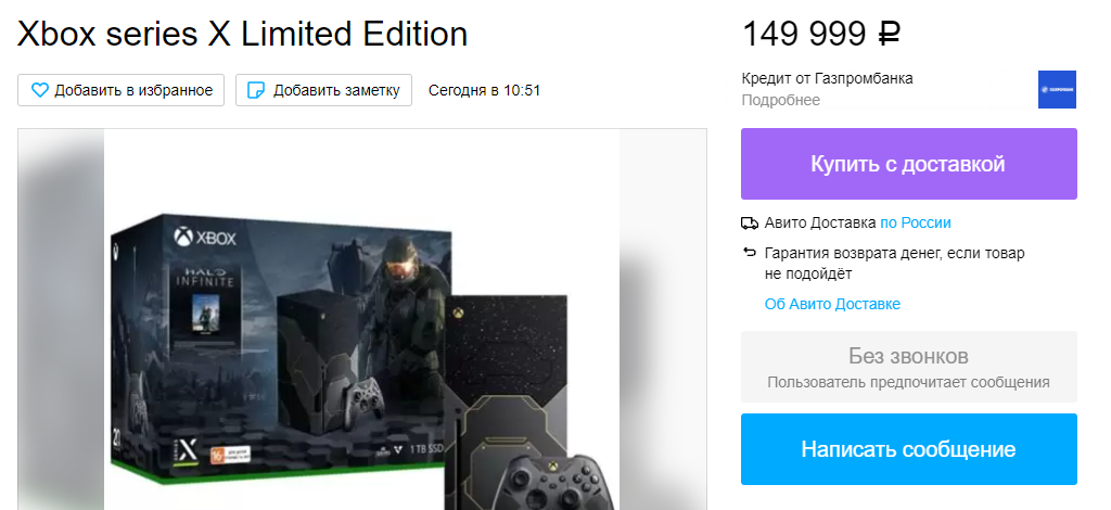 Например, на Авито уже появилось предложение приобрести «Xbox series X Limited Edition» в стиле Halo всего за 149 999.