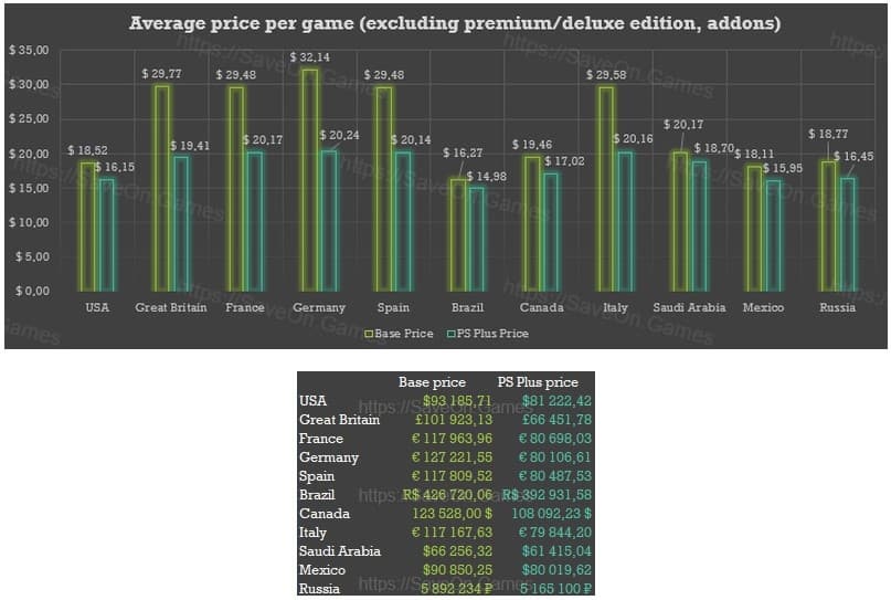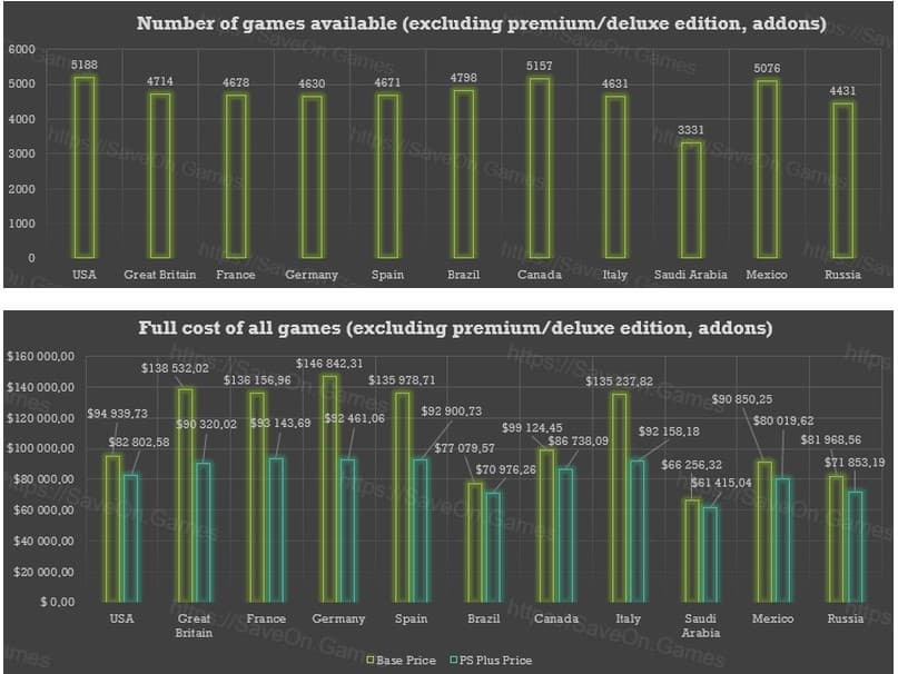 «У меня есть скрипты, которые каждый день собирают цены из PlayStation Store, и я хотел узнать — сколько стоит купить все игры для PS4 в PlayStation Store? Из статистики я исключил все дополнения, премиум-издания, карты, игровые пропуска, игры, имеющие статус предзаказа, и многое другое. Цены рассчитываются в двух колонках. Первая колонка — базовая цена со скидкой, вторая — цена со скидкой при наличии подписки PS Plus. Собранные данные отражают цены только по состоянию на 13 октября, но рисуют конкретную картину, когда речь идет о ценах на все релизы PS4».