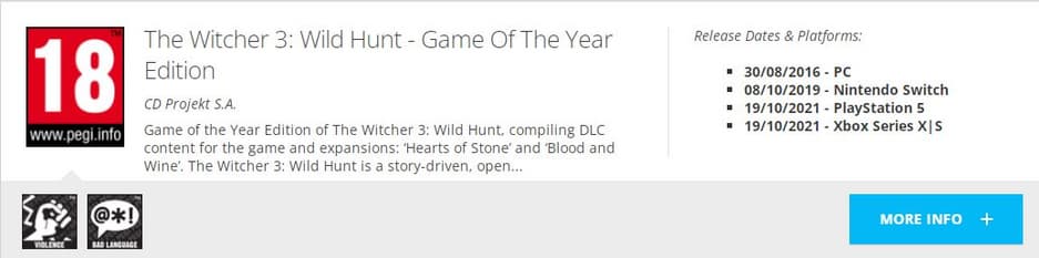 Цензоры из европейской рейтинговой комиссии PEGI (Pan European Game Information) 19 октября присвоили возрастной рейтинг GOTY-изданию The Witcher 3: Wild Hunt для PlayStation 5 и Xbox Series X|S.