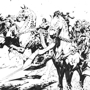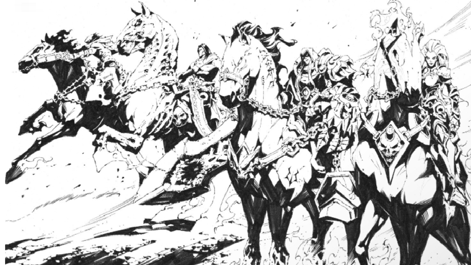 К посту прикрепили арт, на котором красуются силуэты 4 Всадников Апокалипсиса из вселенной Darksiders.