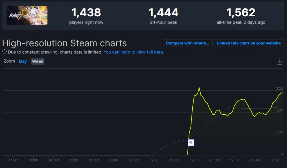 На данный момент HonkaiImpact 3rd в Steam получила 44% положительных отзывов из 604. Пиковый онлайн в Steam составил 1 562.