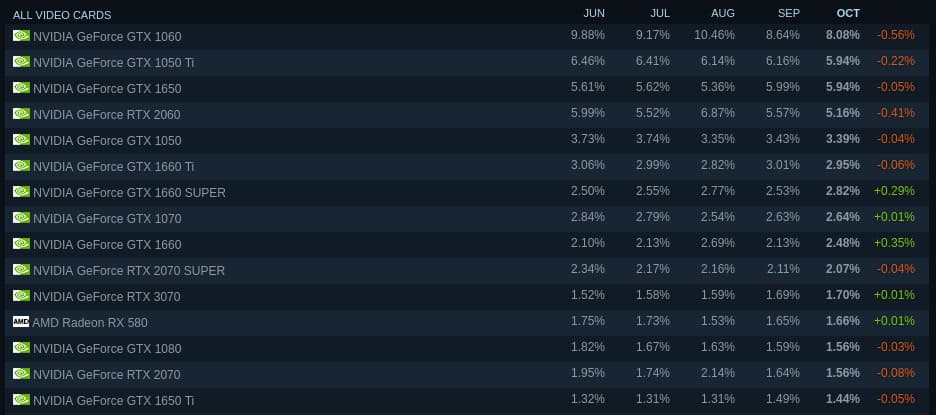 Согласно октябрьскому опросу Steam, карты GeForce RTX 3000 набирают популярность быстрее, чем карты предыдущего поколения, RTX 2000, за аналогичный период прошлого года. Даже несмотря на ограниченную доступность продуктов.