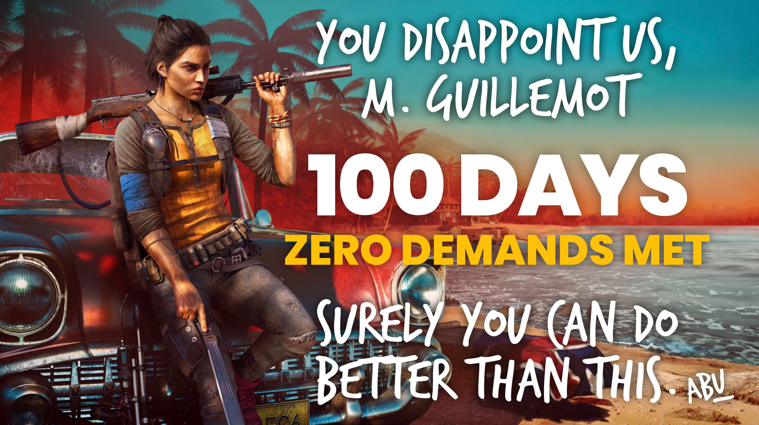 К посту прилагается небольшое изображение-письмо. Оно оформлено в стиле писем с насмешками, которые получали игроки в Far Cry 6: «Вы разочаровали нас, М. Гийемо. 100 дней — ноль выполненных требований. Конечно, вы можете сделать лучше.»