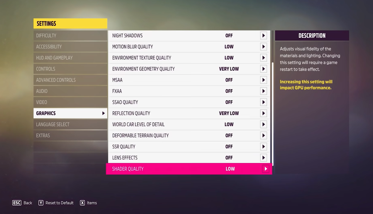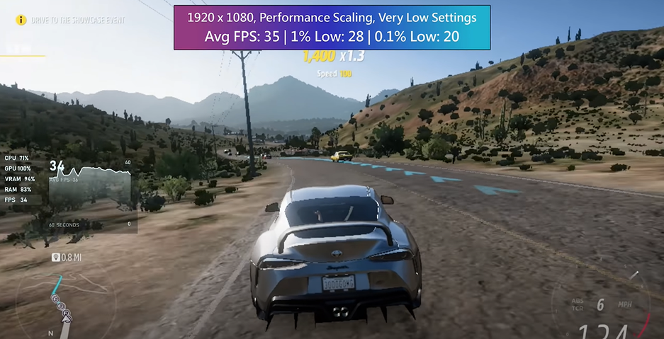 Обычно, при запуске игры без видеокарты настройки снижают в конфиге до предела, включая так называемый «картофельный» режим. Однако, в случае с Forza Horizon 5 достаточно стандартного меню настроек.