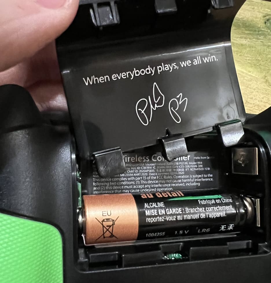 «Когда все играют, мы все выигрываем», — написано под крышкой, где находятся аккумуляторы устройства. Ниже поставлен автограф Фила Спенсера, главы отдела Xbox в Microsoft.