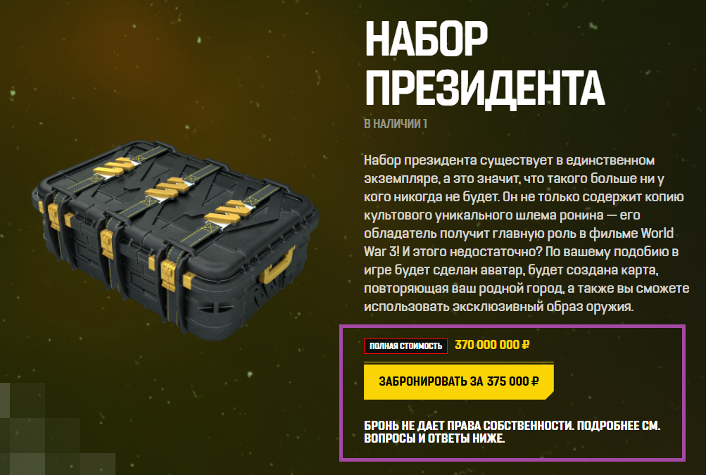 Как пояснили: «После бронирования набора Президента за 375 000 ₽ с вами свяжется представитель MY.GAMES для подтверждения, подписания договора и оплаты оставшейся части суммы (в общей сложности 370 000 000 ₽) для получения права собственности.»