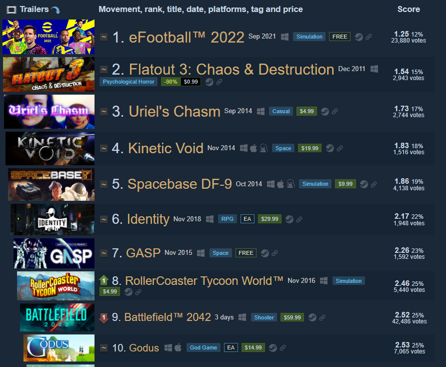 Однако, есть и те, кого текущее состояние игры устраивает, и они отправляют положительные отзывы в Steam. Это привело к тому, что Battlefield 2042 постепенно теряет свои позиции в «десятке» худших игр истории в Steam.