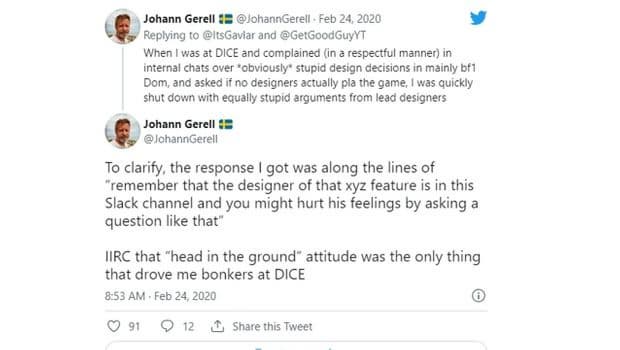 «Когда я работал в DICE и пожаловался (в уважительной форме) во внутреннем чате на явно глупые дизайнерские решения в BF1, и спросил о том, играют ли вообще дизайнеры в игру, меня быстро и в глупой форме осадили ведущие дизайнеры».