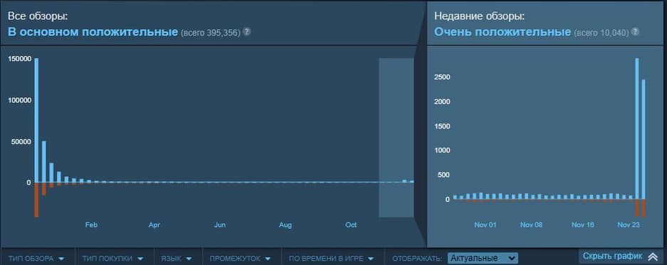 Большой приток новых игроков вытянул рейтинг игры из зоны «смешанных» в «очень положительные». 23 ноября пользователи составили 78 хвалебных рецензий, а 24 ноября это число увеличилось до 2 882.
