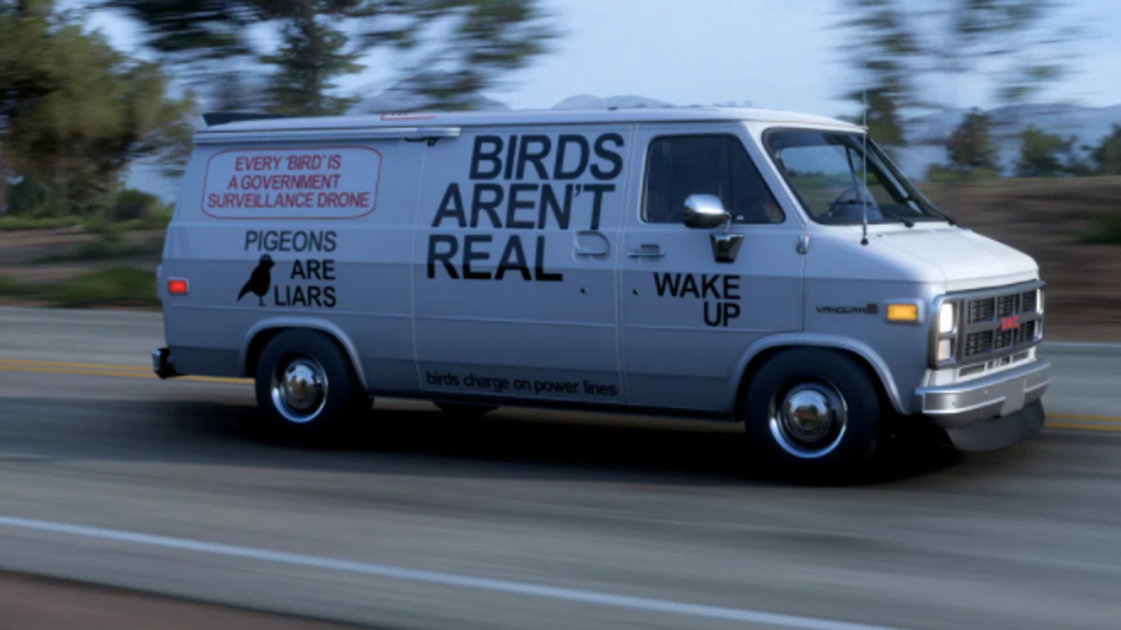 Пользователь imsoswolo решил бросить вызов. Он опубликовал провокационный дизайн своего автомобиля (на обложке). Лозунг Birds aren't real / птицы ненастоящие, отсылка к теории заговора, согласно которой правительство использует птицеподобных роботов для слежки.