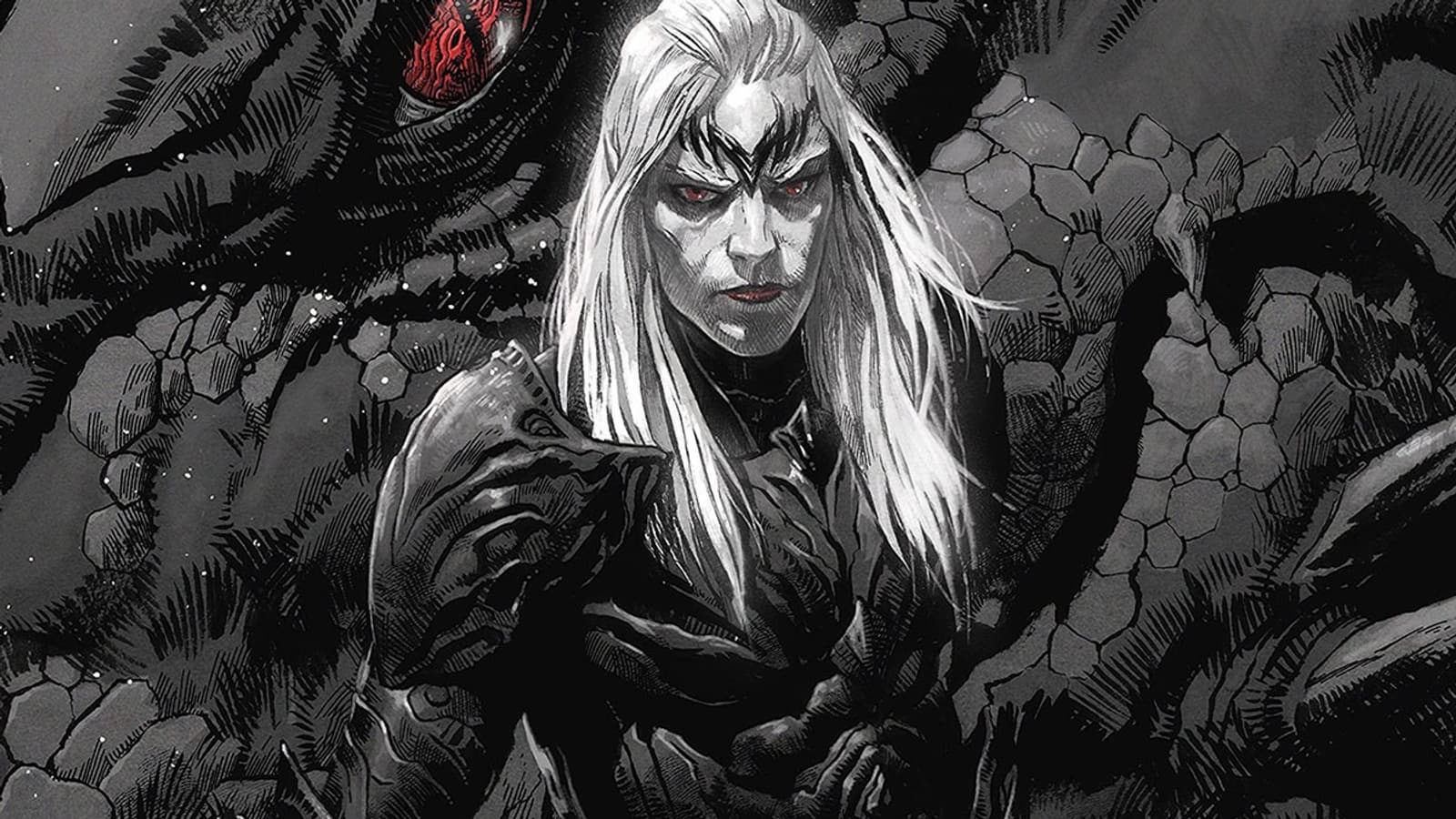 Сюжет базируется на первых шести книгах саги об Элрике, в которых описывается правление последнего колдуна-императора острова-королевства Мелнибонэ. Герой-альбинос находит меч Буреносец, который дарует ему силу и боевые навыки, но он должен питаться душами, включая тех, кто близок Элрику.