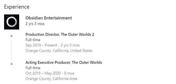 Судя по странице Дэна Мааса из Obsidian Entertainment на LinkedIn, студия начала работу над The Outer Worlds 2 в сентябре 2019 года, когда выход первой части состоялся только 25 октября 2019. Это свидетельствует о том, что разработчики были очень уверены в успехе проекта и намеревались развивать его.