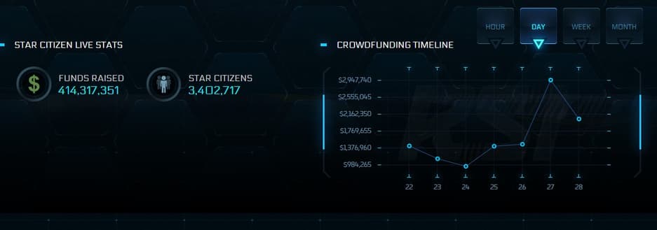Недавно мы сообщали, что Star Citizen привлекла более 400 миллионов долларов от фанатов. И спустя неделю, количество собранных средств преодолело рубеж в 414 миллионов.
