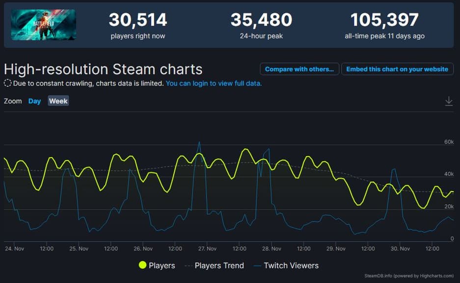 Аудитория многопользовательского шутера Battlefield 2042 продолжает стремительно таять. На текущий момент пиковый онлайн в Steam рухнул с 105 до 30 тысяч активных игроков. Проект EA и DICE выбыл из 20-ки игр с самой активной пользовательской базой и сейчас занимает 33-е место, уступив даже пародийной Crab Game.