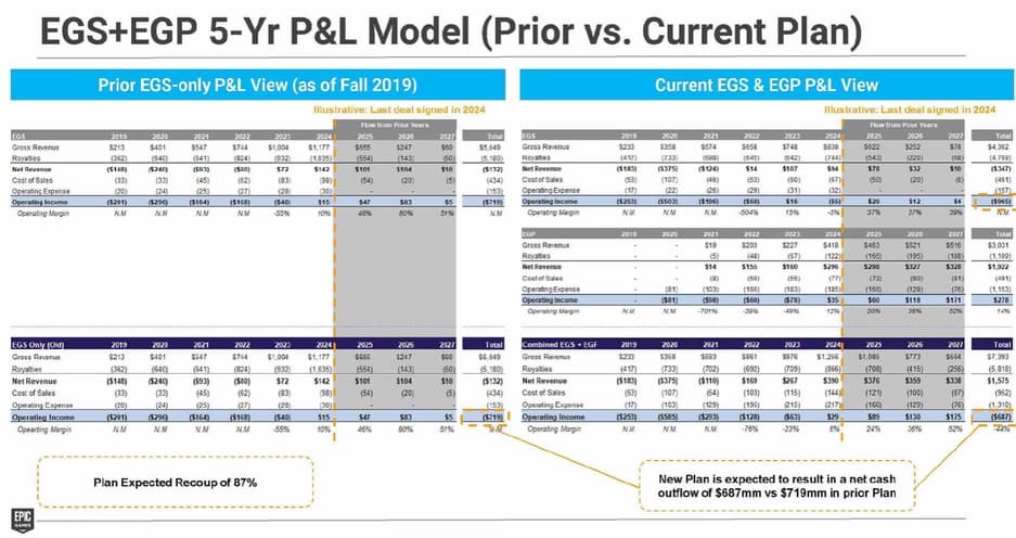 Один из них взят с совещания по стратегии компании Тима Суини в июне прошлого года. На восьмой странице в бумагах сравниваются старый (с осени 2019 года) и новый отчёт о планируемых прибылях и убытках Epic Games Store на ближайшие годы. Наблюдается интересная тенденция: