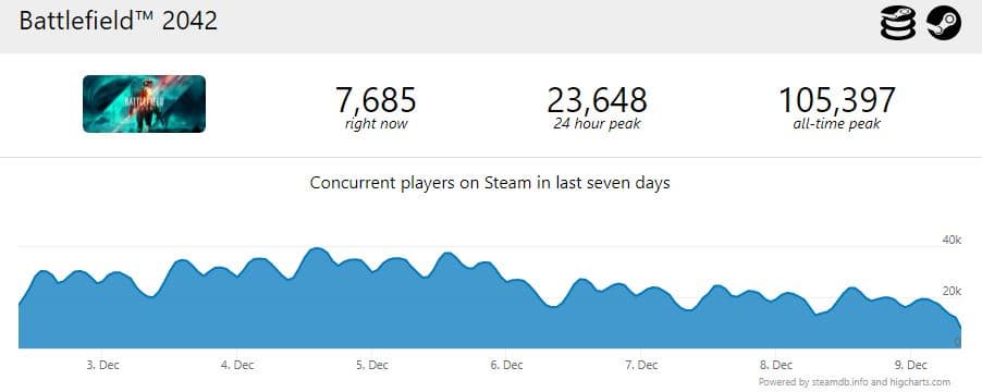 Как показывает статистика SteamDB, количество одновременно активных игроков в Battlefield 2042 в определенный момент рухнуло до 7 тысяч человек, что в 14 раз меньше, чем было на момент релиза игры, состоявшегося 19 ноября. Сейчас показатели стали лучше, но все равно они значительно ниже стартовых.