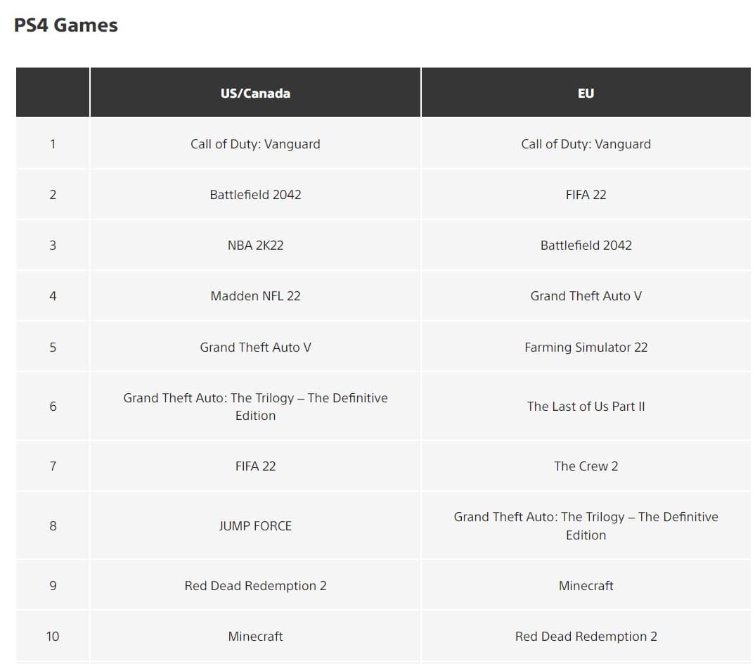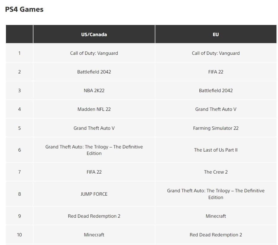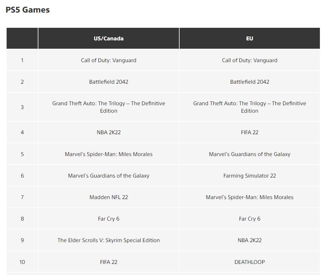 Сравнение с PlayStation 4 выглядит примерно так же, но здесь три игры серии Grand Theft Auto стартовали немного хуже. Call of Duty: Vanguard и Battlefield 2042 хорошо продались на всех актуальных платформах Sony.