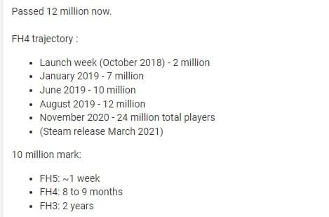 На форуме ResetEra появилась уточнённая цифра – 12 миллионов загрузок за первый месяц с даты релиза. На подобное достижение Forza Horizon 4 потребовалось не менее девяти месяцев. Также приводятся и другие достижения игр серии: