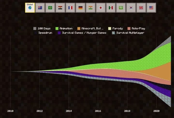 На этой же странице говорится, какой контент, связанный с Minecraft, был самым популярным. В 2021 году больше всего следили за тем, как создатели демонстрируют свои творческие способности в игре. На втором месте расположились анимационные ролики.