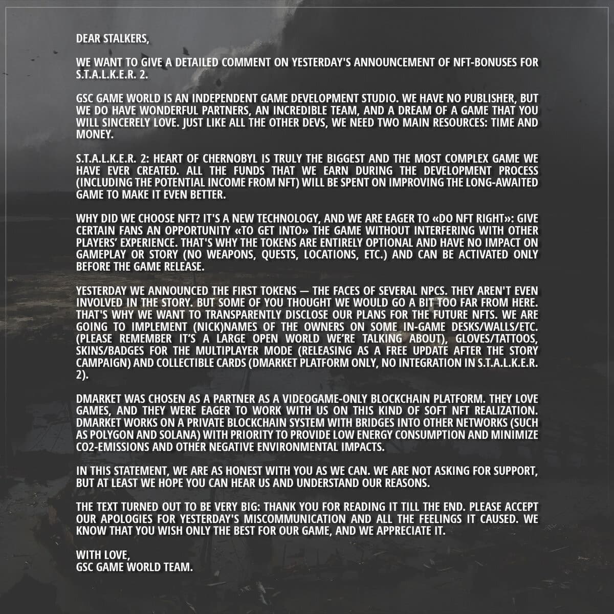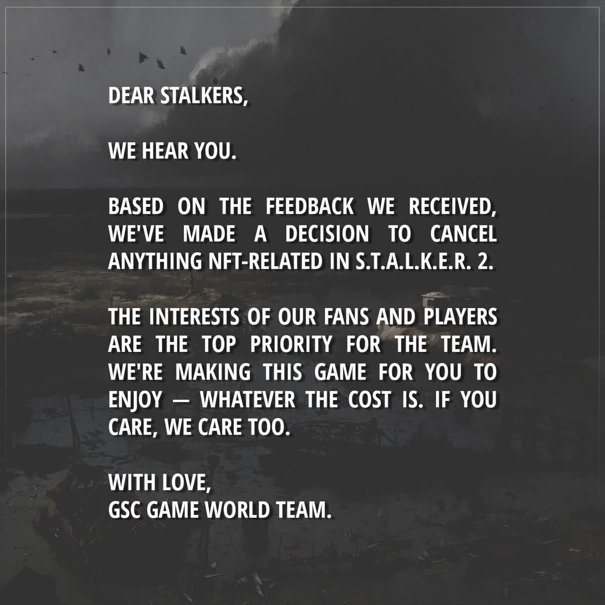 «Дорогие сталкеры. Мы вас слышим. Основываясь на полученной реакции, мы приняли решение отказаться от всего, что связано с NFT в S.T.A.L.K.E.R. 2. Интересы фанатов и игроков для нашей команды превыше всего. Мы делаем эту игру для вас, какой бы не была цена. Если это заботит вас, то нас это заботит тоже».