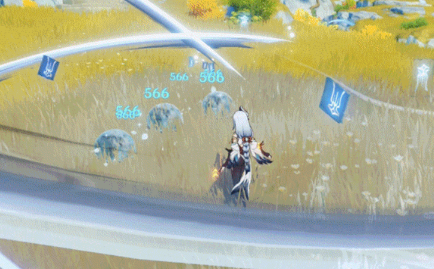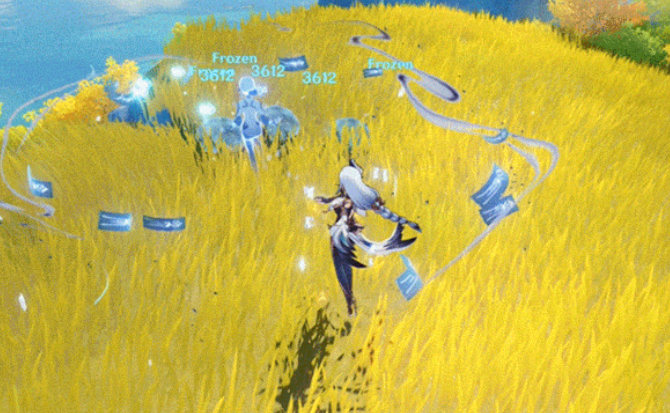 - Талант «Таинственное освобождение»: высвобождает духа, вокруг героини создаётся поле, которое уменьшает крио и физическое сопротивление противников, а также периодически наносится крио-урон.