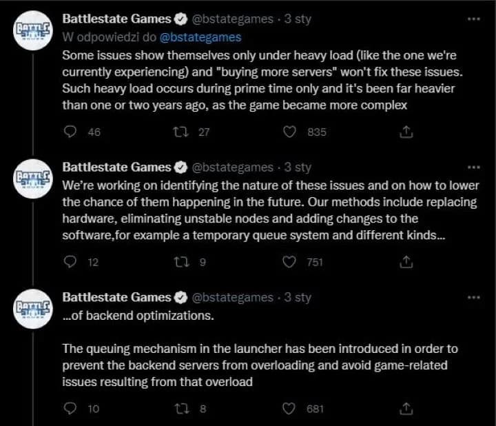 Студия быстро решила проблему, опубликовав серию постов в Twitter. Разработчики признали, что трафик на серверах Escape from Tarkov самый большой за последние два года, и сообщили, что аренда большего количества серверов не решит проблему. Необходимы изменения в программном обеспечении и оптимизация серверной части игры.