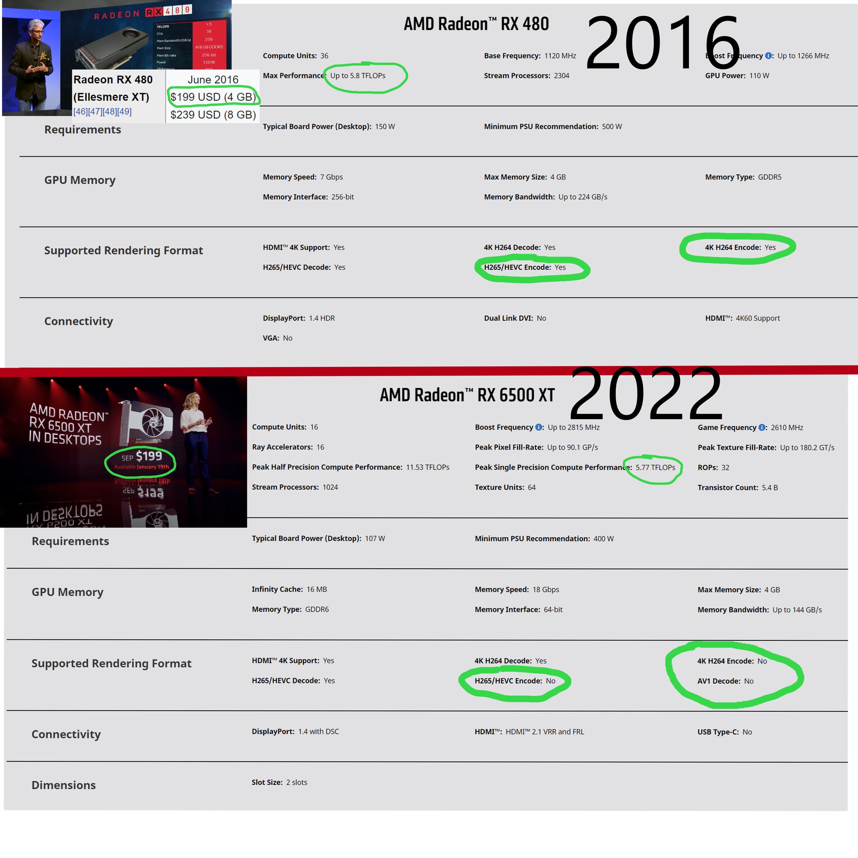 Как оказалось, по многим параметрам еще даже не вышедшая RX 6500 XT уступает выпущенной еще в 2016 году Radeon RX 480, и при этом стоит тех же денег. Более того, у RX 6500 XT не поддерживает кодеки H265 и H264, в отличие от той же RX 480.
