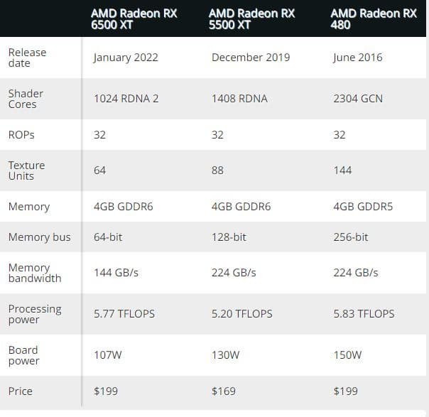 RX 6500 XT «на бумаге» уступает по техническим характеристикам старенькой RX 480, вышедшей в 2016 году