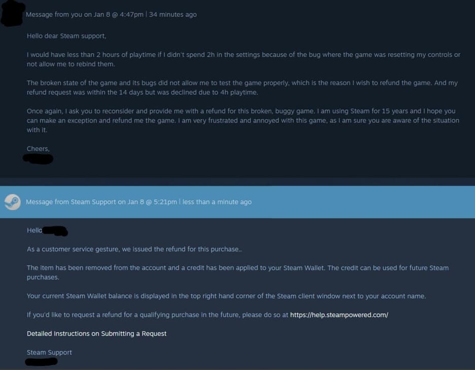 Один из игроков на Reddit предъявил доказательство получения полного возмещения, хотя он играл более 2 часов и совершил покупку более 2 недель назад. В этой ситуации Valve не должна отдавать деньги, но после обсуждения с поддержкой на запрос игрока был дан ответ — он может сделать возврат из-за багов.