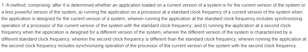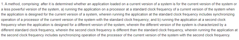В патенте упоминается алгоритм метода: после определения того, предназначено ли приложение, загруженное на текущую версию системы, для неё или менее мощной версии системы, предлагается 2 варианта действий. Приложение просто запускается (стандартная тактовая частота), если подходящее, иначе задействуется «обратная совместимость» (используется вторая тактовая частота).