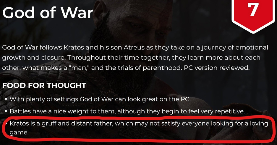 Один из обзоров God of War оказался в фокусе внимания Twitter-общественности. Внимание привлекла не только низкая оценка в 7 баллов, но и критика главного героя игры «Кратос – жесткий [суровый] и отстраненный отец, что может не удовлетворить всех тех, кто ищет любящую игру».