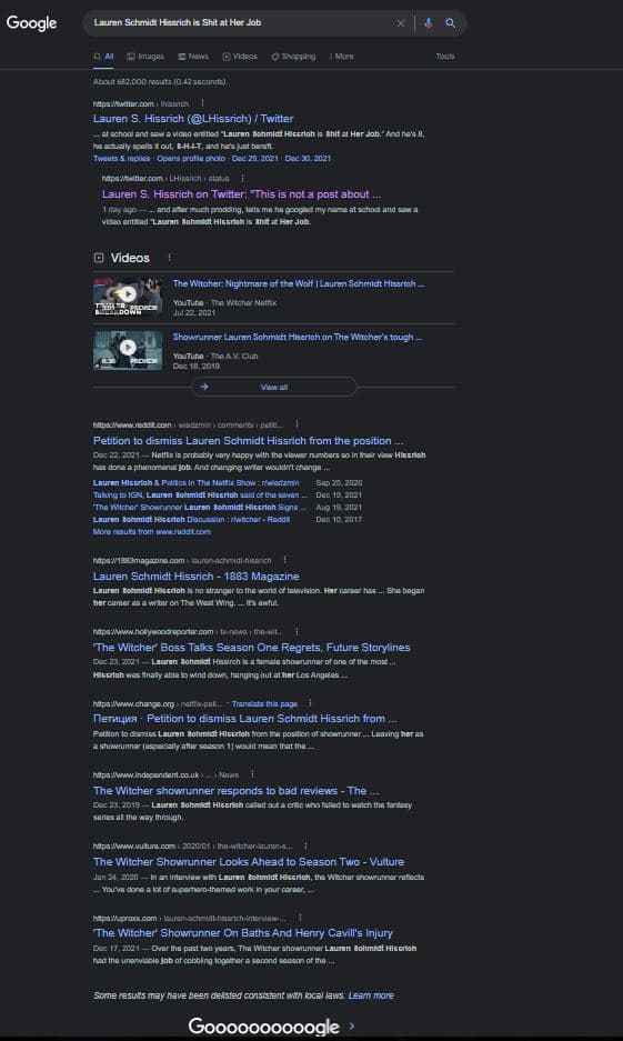 В оригинальной публикации Хиссрич жалуется на видео с заголовком «Lauren Schmidt Hissrich is Shit at Her Job». Ее попросили дать ссылку на этот ролик, поскольку никому почему-то не получается найти его через поисковый сервис Google, как бы они не старались. Нам это тоже не удалось (даже в Bing, даже на 6-й странице Google):