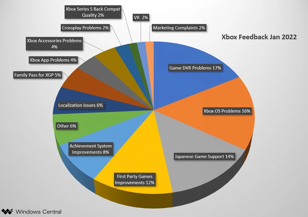 Самая большая проблема, возникающая в 17% случаев, касается Xbox Game DVR - функции, позволяющей записывать игровые сцены, делать скриншоты и управлять прямыми трансляциями. 16% отмечают, что существуют проблемы общего характера с операционной системой консолей. На третьем месте с 14% находится мнение об отсутствии поддержки японских студий-разработчиков, которые чаще обращаются к консолям конкурентов. Но стоит отметить, что новое поколение Xbox показало положительный эффект в Японии.