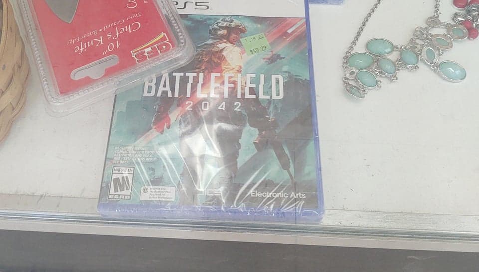 Диск Battlefield 2042 не просто оказался на барахолке. Выставлена запечатанная копия игры, и на ней наклейка: «1.19.22 $40,29».