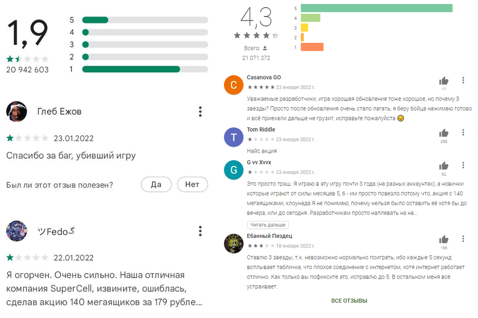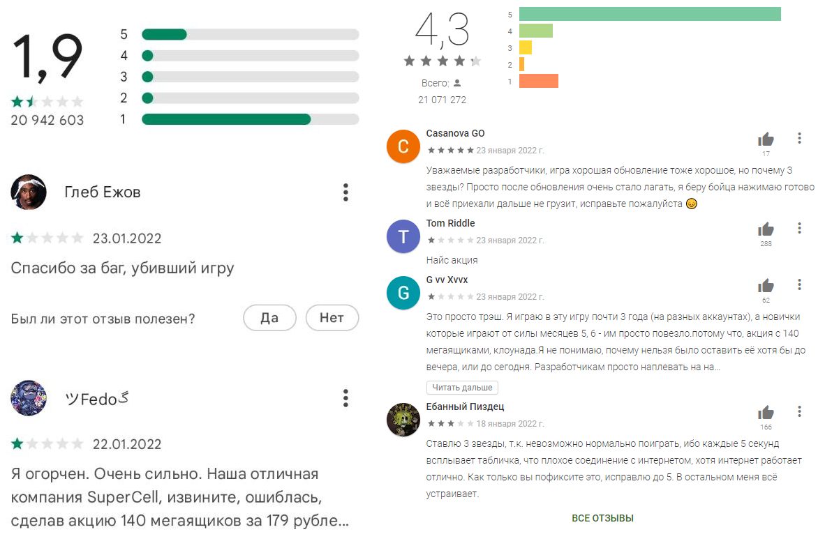 Для понимания, игрок подсчитал, что данный набор за 180 рублей содержал контента на 53 тысячи рублей. Как жаловались в одном из отзывов: «4 года моей жизни [игры в Brawl Stars] купили за 179 рублей». Откатить изменения или выплачивать компенсацию авторы игры отказались.