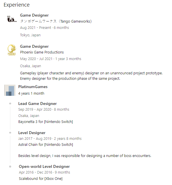 Судя по профилю LinkedIn, он был ведущим геймдизайнером Bayonetta 3 для Nintendo Switch в период с сентября 2019 по апрель 2020 года, а также работал над уровнями для Astral Chain и отменённой Scalebound.