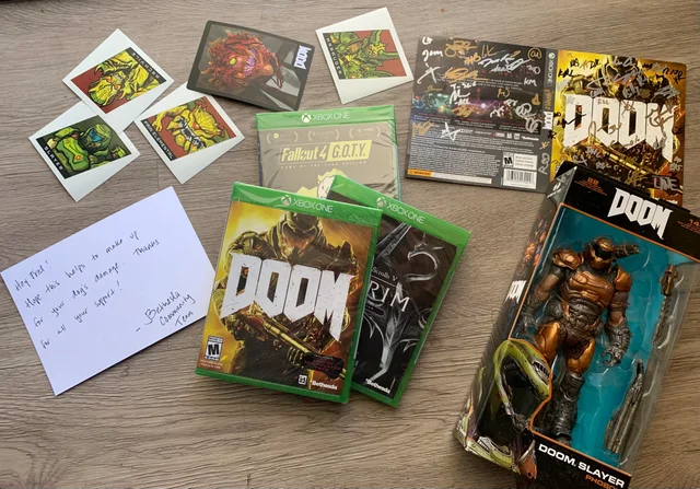 Команда Bethesda обратили внимание на историю геймера. С ним связались и он получил комплект игр: DOOM, Fallout, TES V: Skyrim, а также набор открыток и фигурку Думгая.