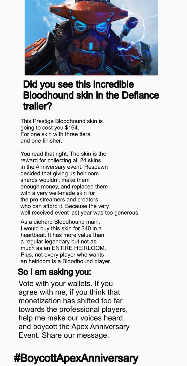Dependent_Brick высказался по поводу того, что данный бойкот не имеет смысла: «Вы считаете, EA думала, что все будут покупать это? Им нужен только 1% игроков, который купит скин [за 164 доллара], и они купят». Beautiful_Range1079 подхватил его мысль: «Верно. Игра бесплатная, и большинство людей все равно не тратят на неё деньги. Они [EA] рассчитывают на китов [люди, основательно вкладывающиеся в проект], которые будут покупать эти вещи, сколько бы они ни стоили».