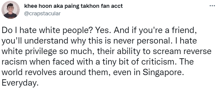 «Ненавижу ли я белых людей? Да. Если ты мой друг, то ты понимаешь, что в этом нет ничего личного. Я сильно ненавижу привилегию белых и их постоянные крики об обратном расизме всякий раз, когда они сталкиваются с малейшей критикой. Мир крутится вокруг них. Даже в Сингапуре. Каждый день». [комментарий удален, но интернет помнит]