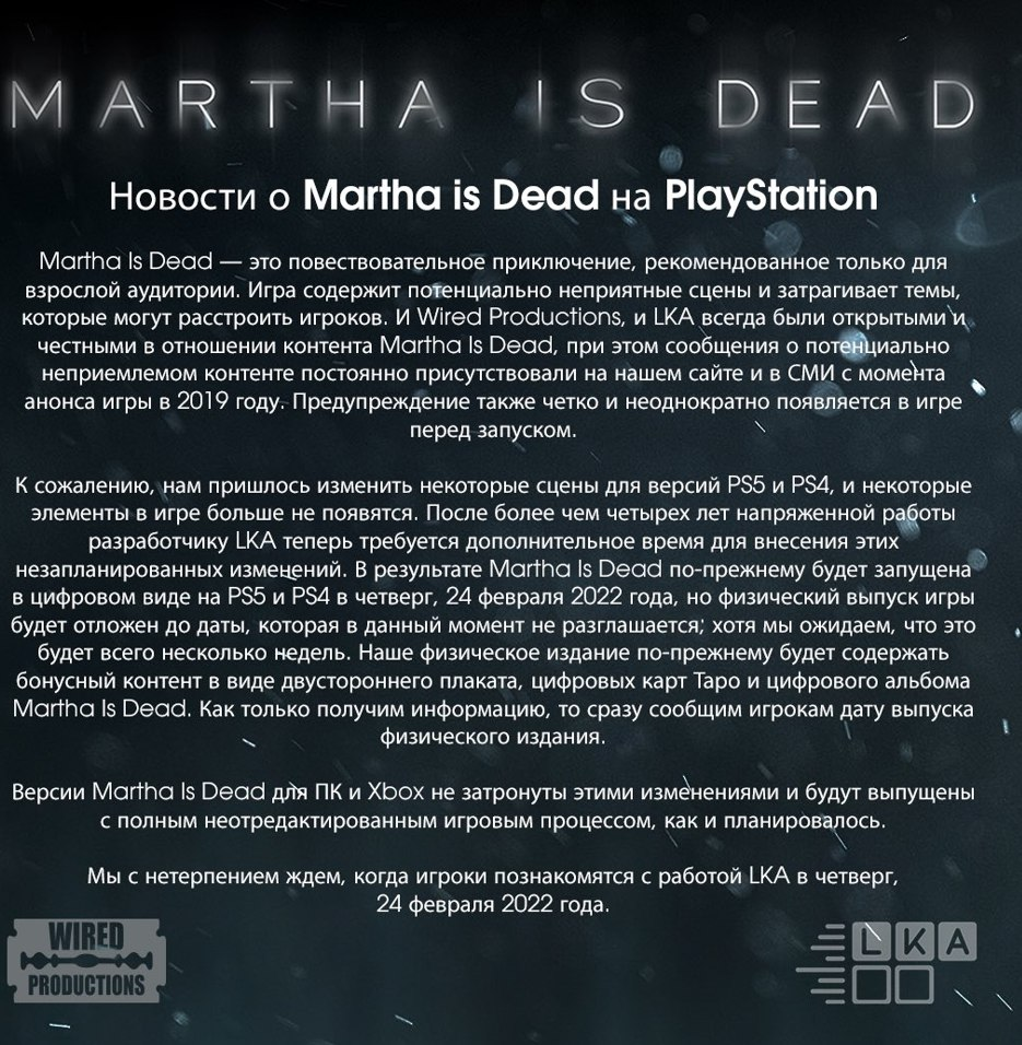 Тем не менее они были вынуждены внести корректировки в PlayStation-версии: «Мы с сожалением сообщаем, что нам пришлось изменить Martha Is Dead для PS4 и PS5: некоторые элементы больше не играбельны».