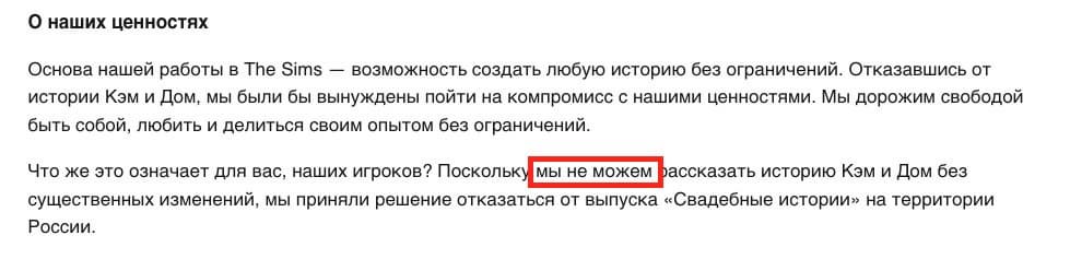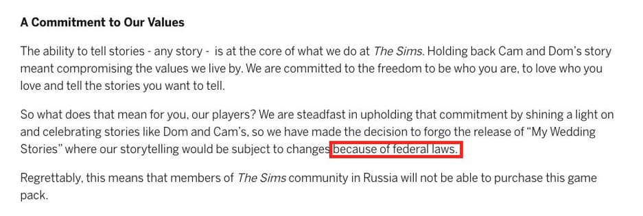 Причиной послужил отказ издательства выпускать дополнение для Sims 4 со свадебной тематикой на территории России и других стран СНГ