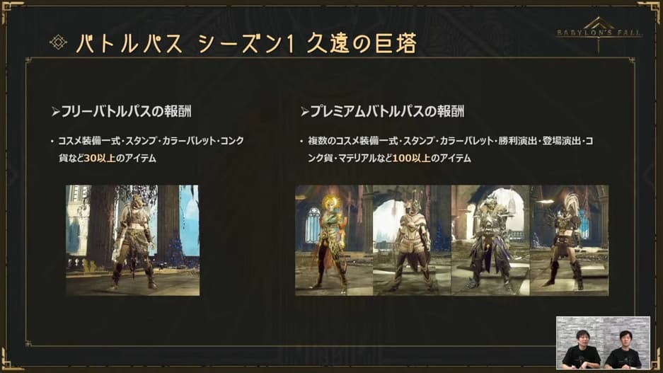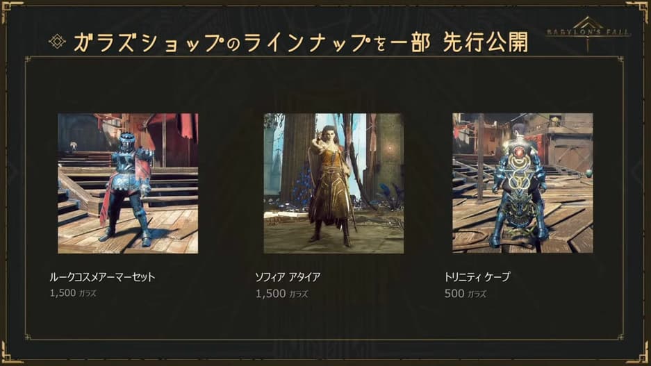 В платной игре Babylon's Fall будет специальная валюта Garaz, которая будет продаваться по 110 йен (примерно 0,95 доллара) за 100 единиц, цену для Запада не уточнили. Она даёт доступ исключительно к косметическим предметам, которые не влияют на игровой процесс.